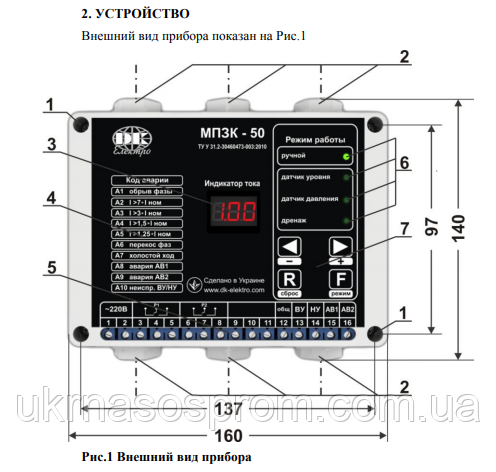 Мікропроцесорний прилад МПЗК-50 забезпечує надійний захист і автоматичне управління трифазними електродвигунами насосних агрегатів. Працює в режимах “водопідйом” і “дренаж”, підтримує ручне й автоматичне керування.